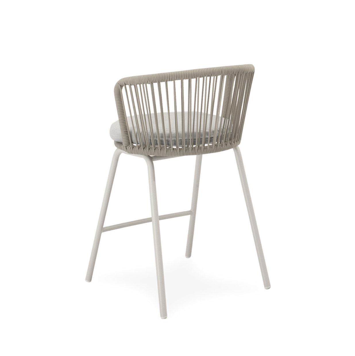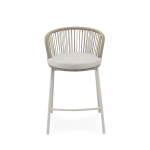 El taburete PIERRE combina un estilo contemporáneo con un diseño pensado para aportar comodidad y frescura a cualquier espacio exterior. Su respaldo curvo, elaborado en cuerda resistente, presenta un entramado lineal que crea un efecto visual ligero y dinámico. Esta estructura no solo envuelve suavemente la espalda, sino que también permite una ventilación natural, perfecta para los días más cálidos.